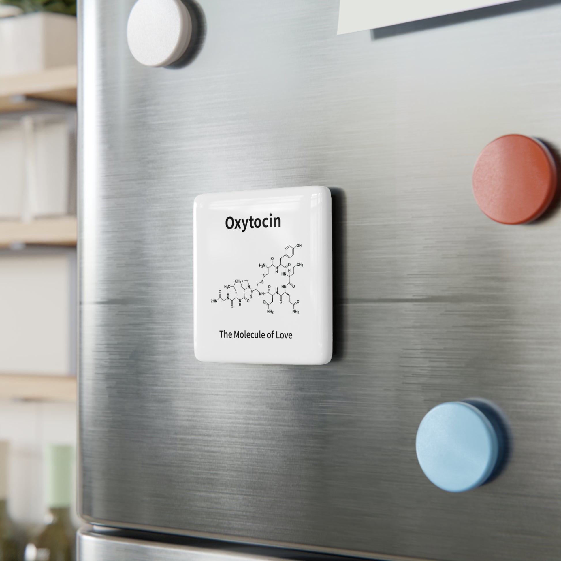 A small porcelain magnet that celebrates the science behind connection. The glossy 2" square surface features a crisp, black-and-white illustration of the oxytocin molecule with the label “Oxytocin” and the subtitle “The Molecule of Love.” It sits flush on refrigerators or magnetic boards, adding a subtle, nerdy accent to kitchens, study spaces, or lab corners. The clean, minimalist design lets the chemistry shine while the high-gloss coating makes lines and text pop. This magnet works as a quiet reminder of shared moments — a tiny piece of science that sparks conversation and warmth every time someone reaches for the fridge.